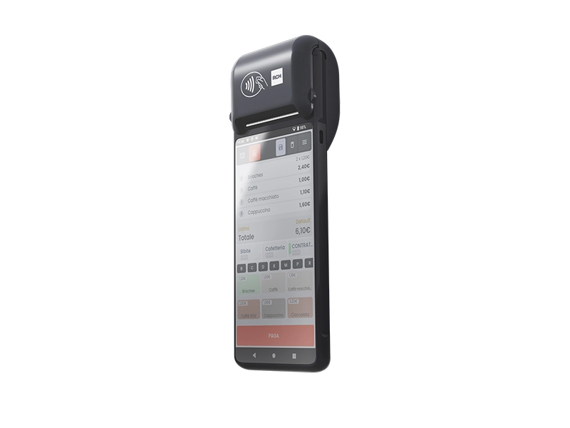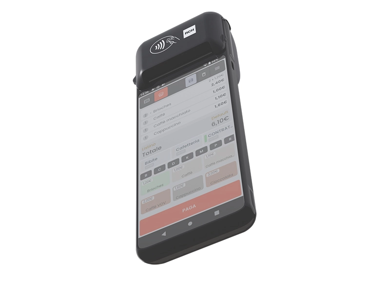 Il dispositivo integra la funzione di incasso digitale grazie alla compatibilità con RCH Pay SoftPOS, consentendo di accettare pagamenti elettronici direttamente dal registratore telematico. È sufficiente inserire l’importo e avvicinare la carta del cliente per completare la transazione, eliminando la necessità di POS esterni e semplificando la gestione del punto cassa.